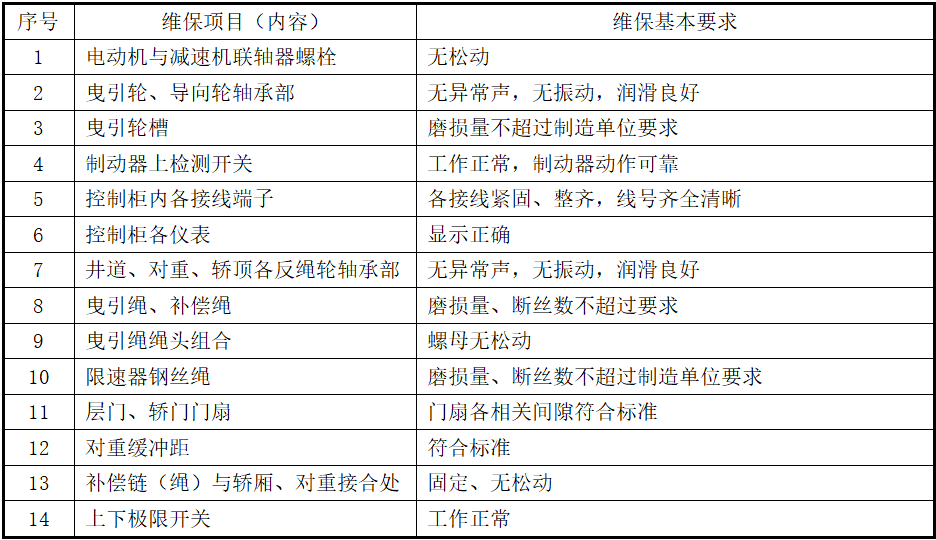 注:1、如果某些电梯没有表中的项目(内容)或不含有某种部件,项目(内容)可适当进行调整(下同);