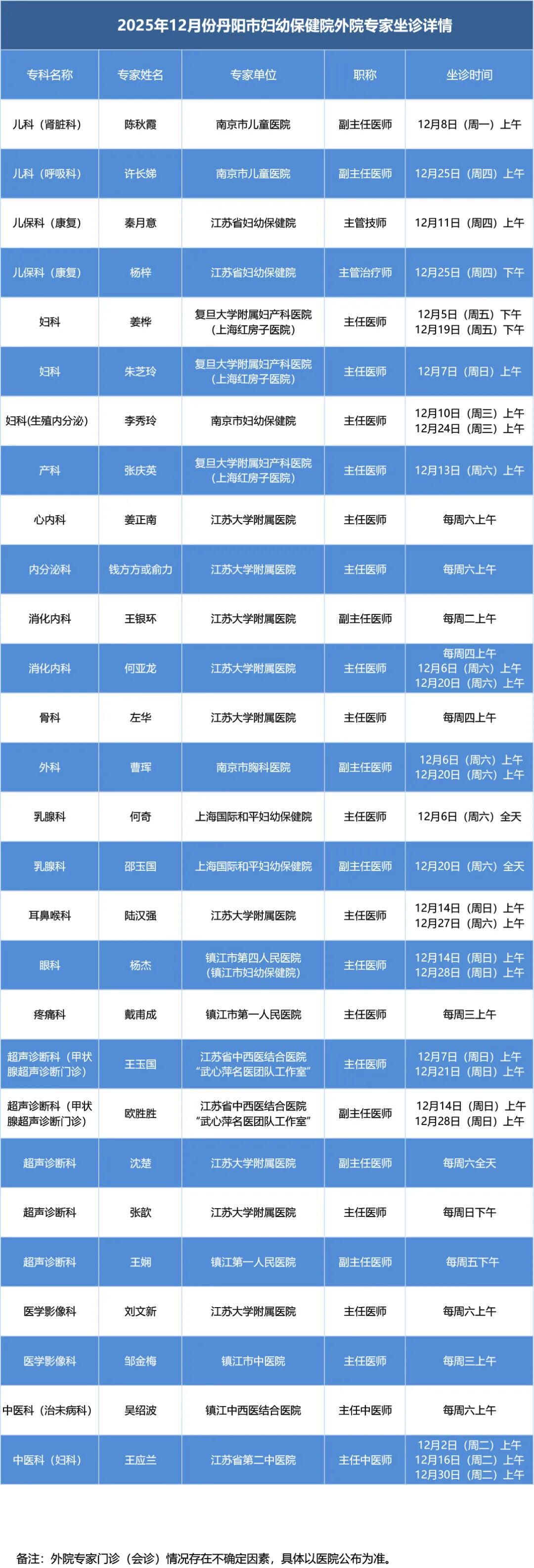 为方便您了解丹阳市妇幼保健院(丹阳二院)外院专家门诊出诊情况,合理安排就诊时间,现将近期外院专家出诊时间整理如下。