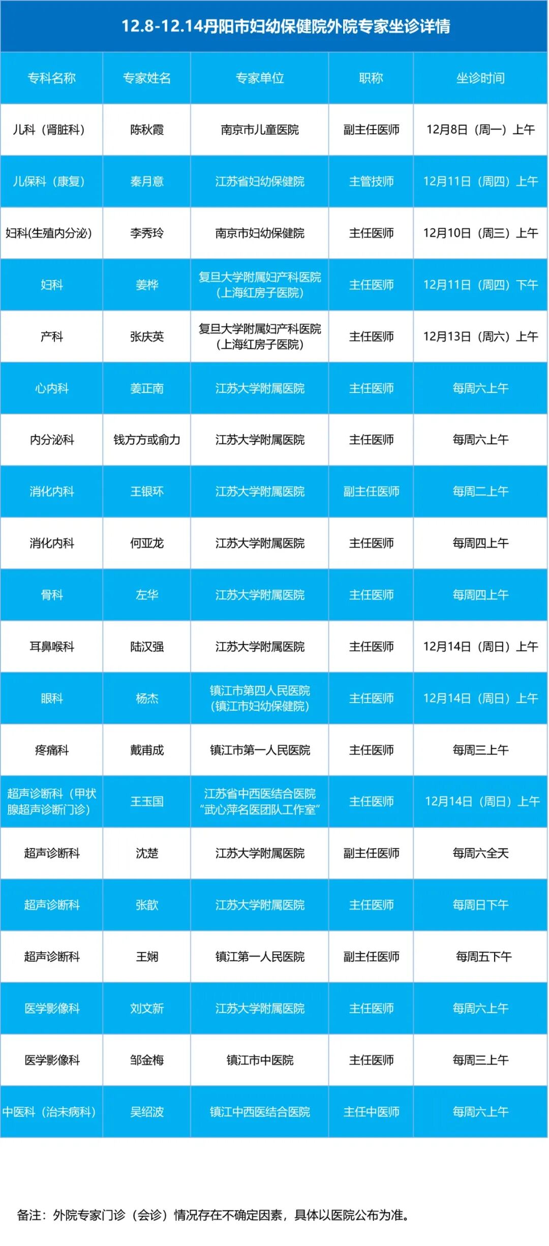 为方便您了解丹阳市妇幼保健院(丹阳二院)外院专家门诊出诊情况,合理安排就诊时间,现将近期外院专家出诊时间整理如下。