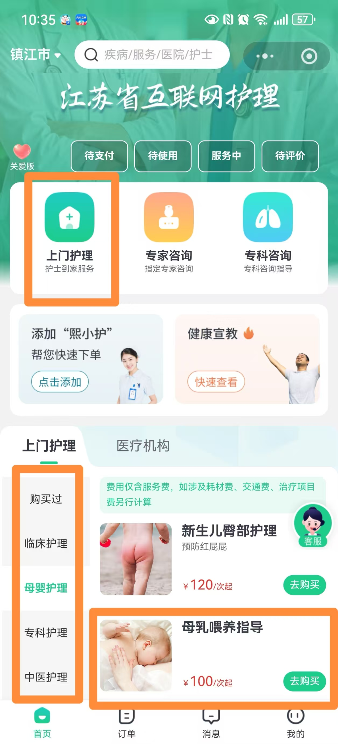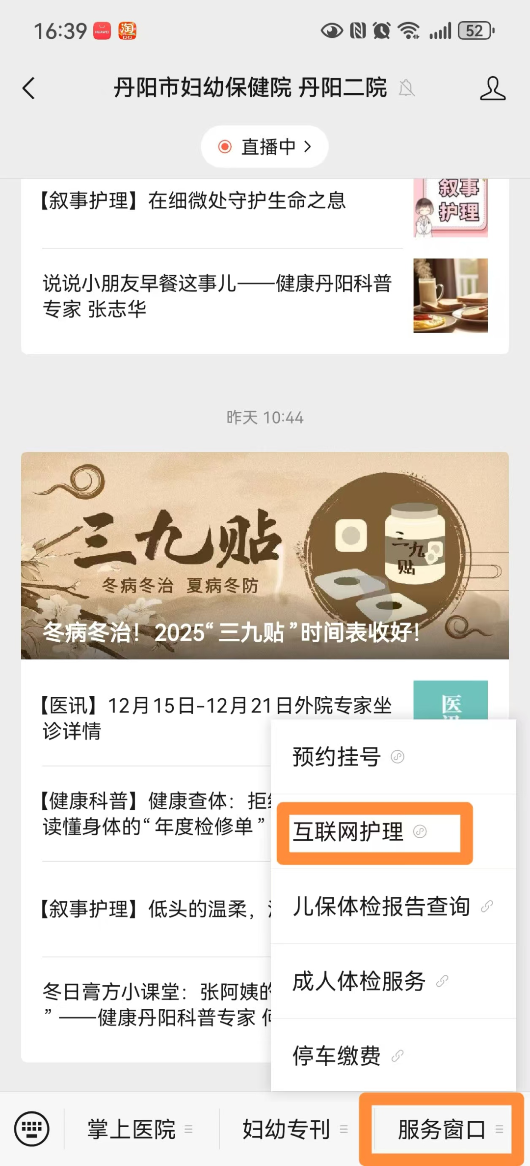第一步:预约渠道。关注“丹阳市妇幼保健院 丹阳二院”官方微信公众号,在菜单栏“服务窗口”点击“互联网护理”进入小程序。