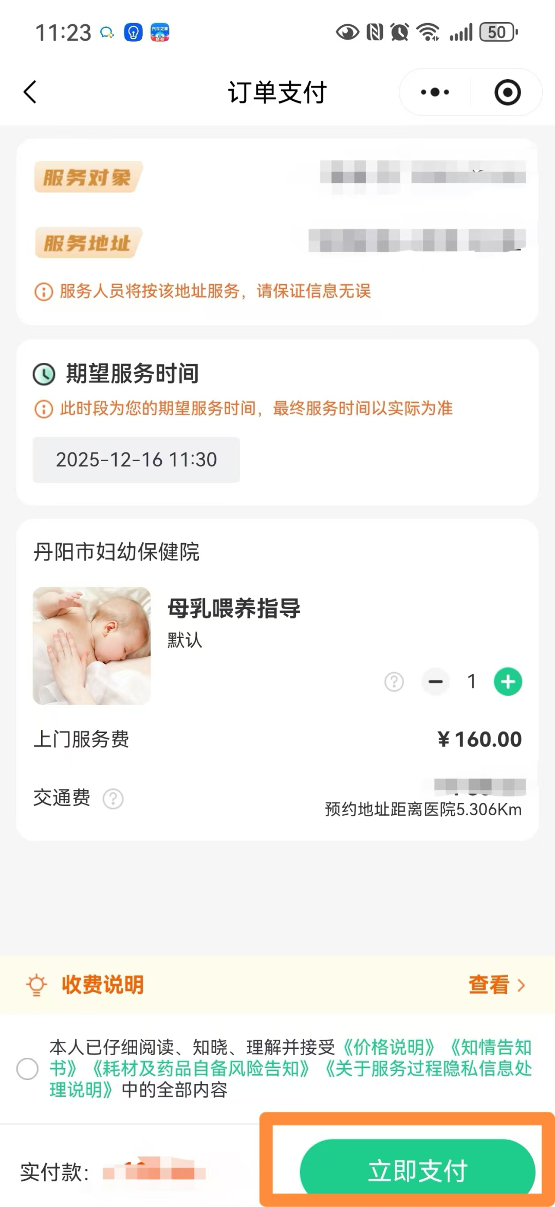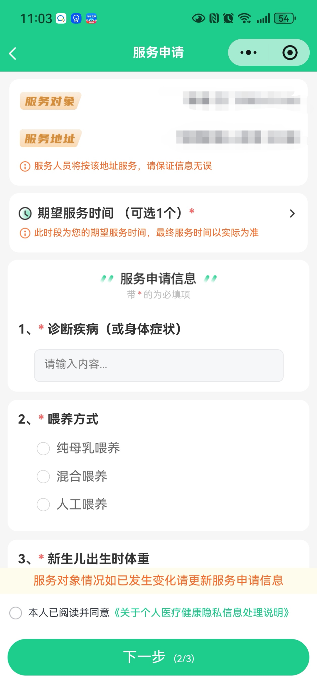 第三步:填写信息。按要求填写个人信息、服务地址、预约时间等内容,并阅读知情同意书。