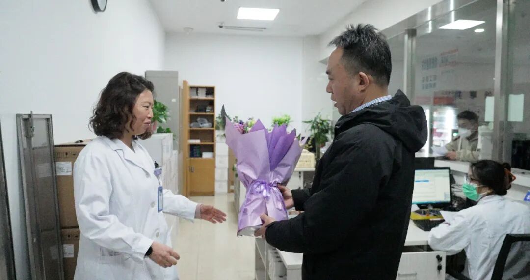 2月14日,周书记、朱院长详细询问了节日期间医疗排班、患者收治及后勤保障情况,同时对院区医护人员的辛勤付出表示诚挚感谢,并送上鲜花、蛋糕、大礼包和节日祝福。